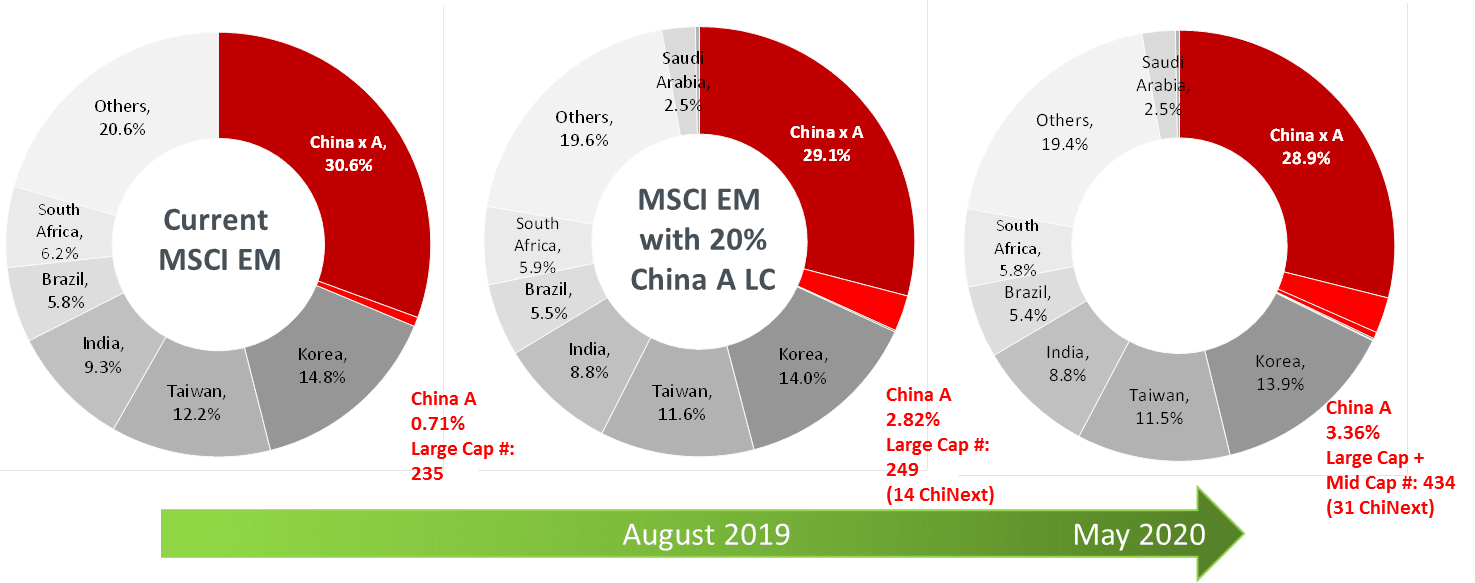 The initial inclusion of 235 China A large-cap shares into the MSCI Emerging Markets Index was a special transition measure to help first time A shares investors cope with such a large number of additions. The inclusion of mid-cap shares would align the China A shares component methodologically to the rest of the markets included in the MSCI Global Investable Market Index, which includes both large- and mid-cap representation.