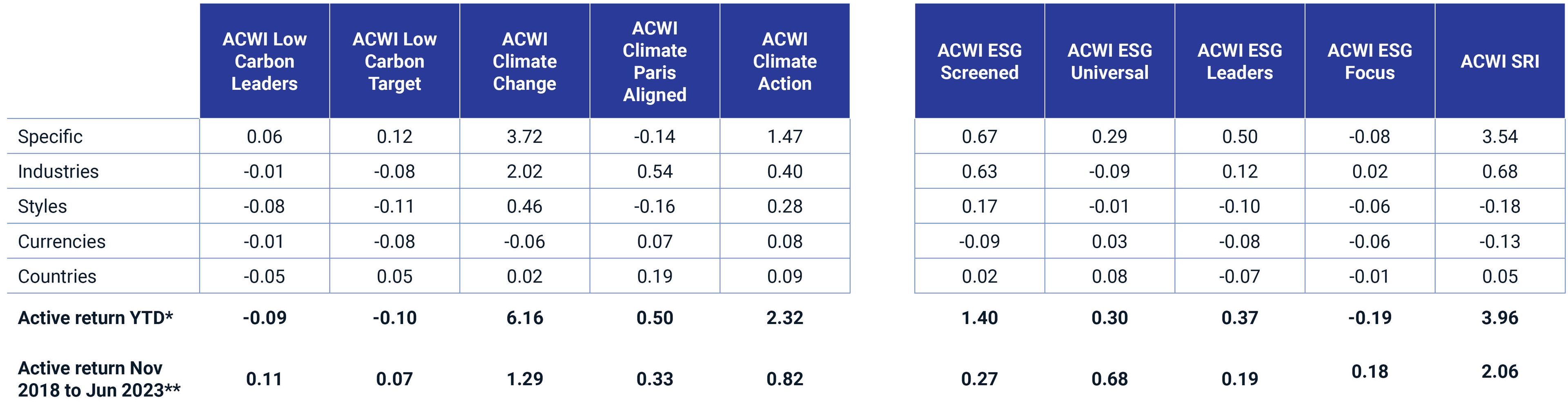 - Most of the MSCI ACWI Climate and MSCI ACWI ESG Indexes outperformed the MSCI ACWI Index in the first half of 2023, driven mainly by stock-specific effects and positive returns in the information-technology sector.