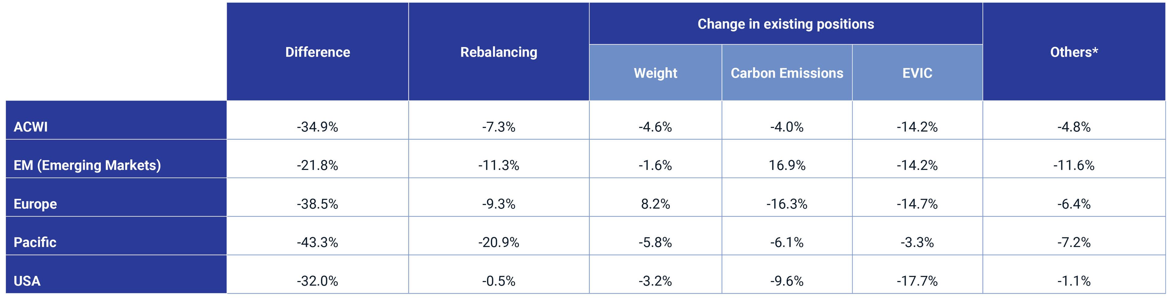 To identify the contribution of different decarbonization drivers, we conducted an attribution analysis on the five indexes. We provide an example of the analysis using the MSCI Emerging Markets Index.