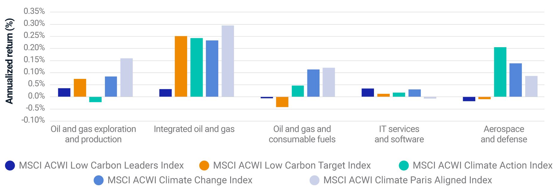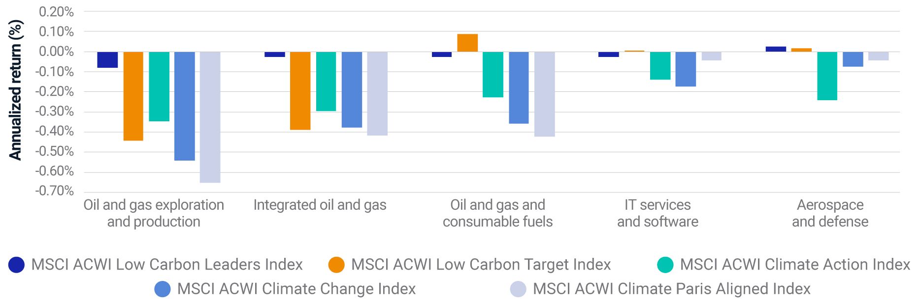 In addition, a rise in geopolitical tensions translated into positive momentum for aerospace and defense companies. As the MSCI Climate Indexes exclude controversial-weapons companies, the outperformance of aerospace and defense companies adversely impacted their performance.