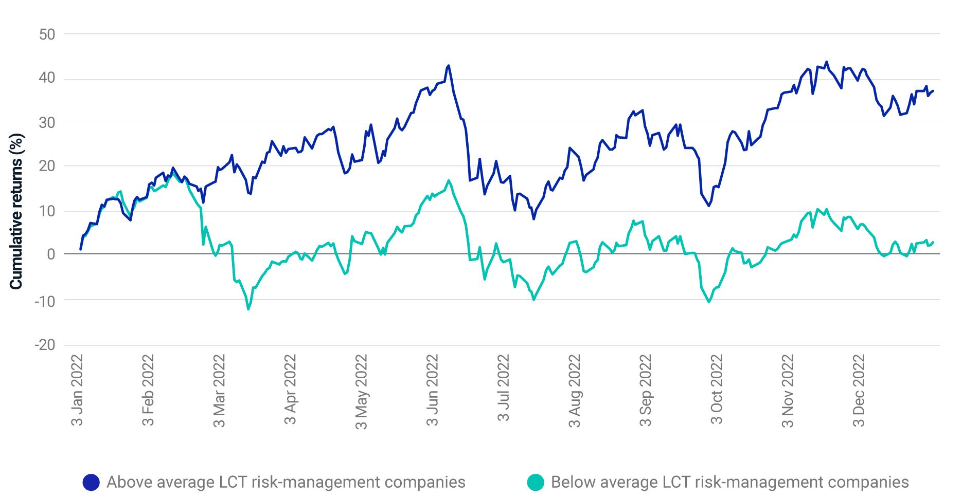 Cumulative returns for above average and below average LCT risk-management companies. Dec. 31, 2021, to Dec. 30, 2022.