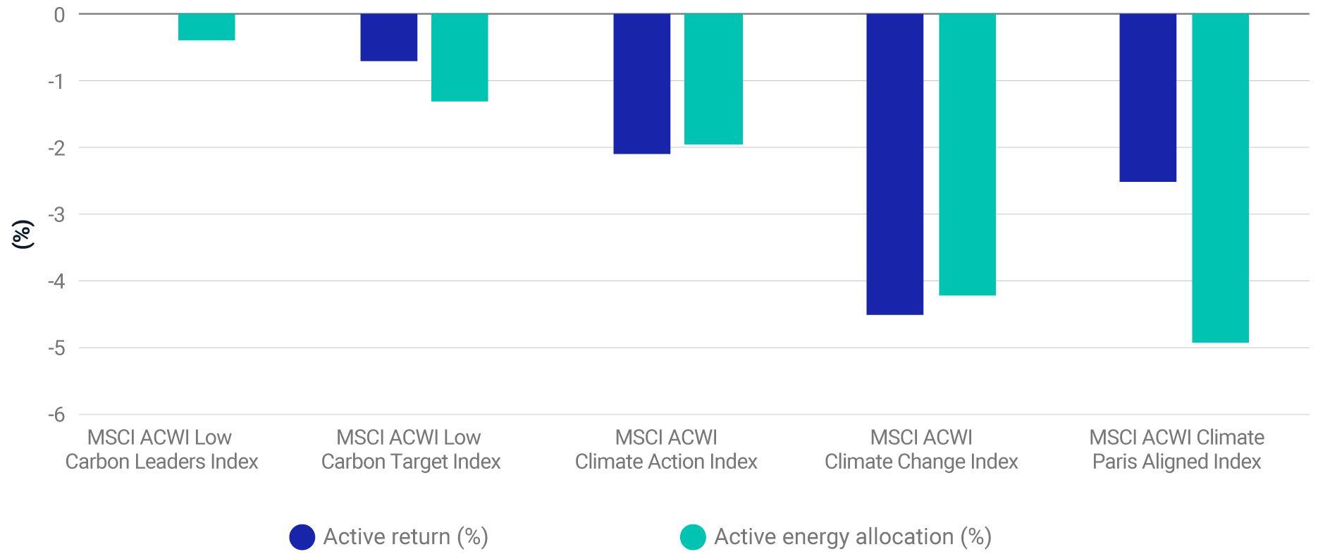 The chart shows active return vs. the average active allocation to the energy sector for respective MSCI ACWI Climate Indexes in 2022.