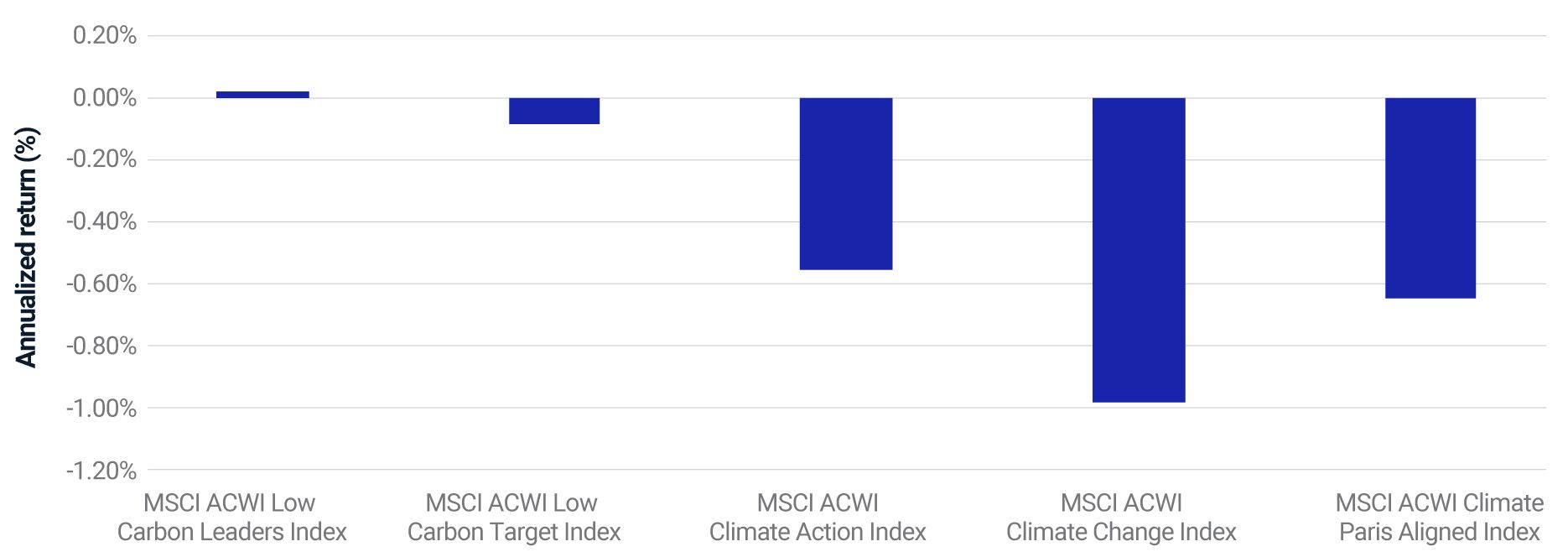 MSCI ACWI Climate Indexes aim to achieve a lower carbon footprint than the broader MSCI ACWI Index, which led to higher allocations to carbon-efficient companies within each sector. Their performance was also supported by the relative outperformance of both intra-sector, carbon-efficient companies, as well as better-rated ESG companies.