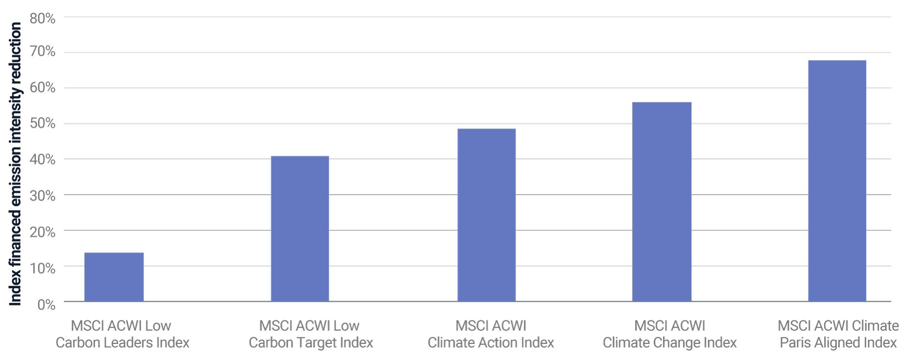Average % reduction in Index financed emission intensity (tCO2/$ million EVIC) for ACWI climate indexes relative to MSCI ACWI for 2022. The average is computed based on the month end Index financed emission intensities.