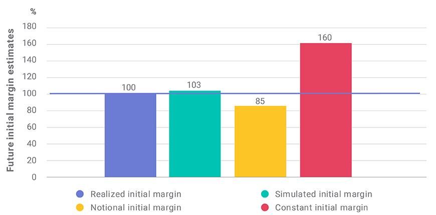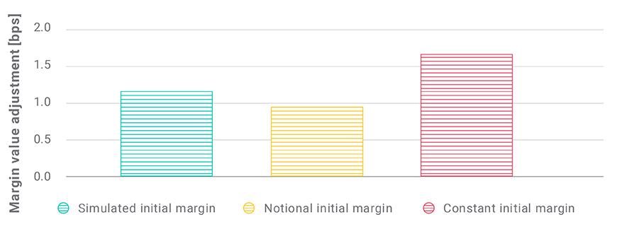While the initial margin has key importance in counterparty risk, it also affects the fair value of the underlying derivatives transactions, since parties need to fund the collateral posted as initial margin.12 The exhibit below shows how a loosely calculated initial margin resulted in margin-value adjustments that did not reflect how various initial-margin models gave rise to contrasting margin-value adjustments. Compared to the simulated initial margin, the notional initial margin resulted in a 20% lower valuation adjustment, while the constant initial margin led to a 45% higher valuation adjustment.