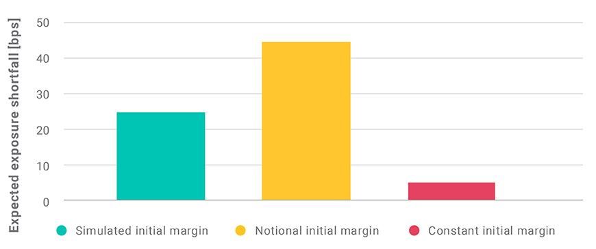 Although it is widely believed that the new rules would effectively eliminate counterparty credit risk, the received initial margin might not be enough to cover the exposure in extreme market scenarios.10 The exhibit below quantifies that risk and demonstrates that, for the hypothetical portfolio discussed above, the average expected exposure shortfall was 80% lower for the constant initial margin as compared to the simulated initial margin.11 The initial margin based on notional scaling led to a difference of similar magnitude in the opposite direction. In other words, depending on the method you may get vastly different risk estimates.