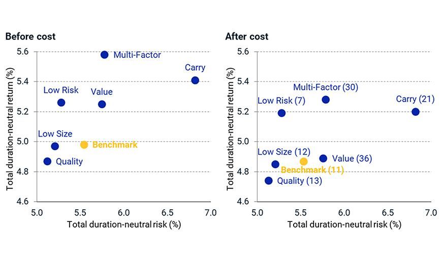 Simulated performance of long-only factor-tilted strategies and the MSCI USD IG Corporate Bond Index, before and after including transaction costs (cost in bps in parentheses). Total duration-neutral return (risk) is the return (risk) of the long-only corporate-bond strategy after neutralizing for the active (relative to benchmark) duration-matched Treasury returns. Multi-factor is derived from value, low size, carry and low risk. Sample period is September 2005 to June 2019.