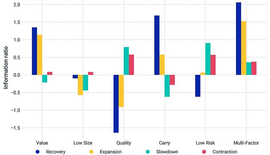 Simulated average active excess risk-adjusted returns of long-only factor-tilted strategies versus the MSCI USD IG Corporate Bond Index, without transaction costs, under four economic scenarios. Multi-factor is derived from value, low size, carry and low risk. In the four economic scenarios, recovery is defined as a positive three-month change in the OECD's CLI with current level below 100; expansion as a positive three-month change in CLI with current level above 100; slowdown as a negative three-month change in CLI with current level above 100; and contraction as a negative three-month change in CLI with current level below 100. Sample period is September 2005 to June 2019.