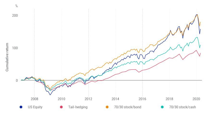 - The cost of implementing a tail-hedging strategy is correspondingly high. Unless very well-timed before crises, our hypothetical tail-hedging strategies have lagged simulated portfolios that simply reduced exposure to risky assets.