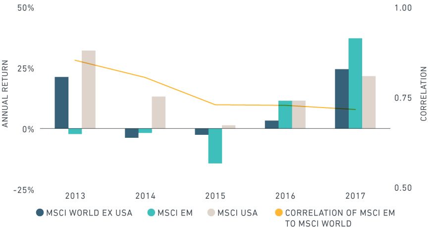 Developed market vs. emerging market country returns (2017)
