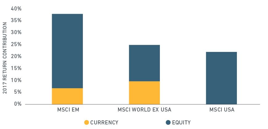The emerging markets rally, the U.S. dollar's depreciation and the resurgence of global growth were the top three drivers behind a double-digit rally in global equities last year. Stocks were led by the MSCI Emerging Markets Index's 38% return. Developed markets, as represented by the MSCI World Index,1 returned 23% last year. As we enter 2018, investors will monitor whether these themes continue into the New Year.