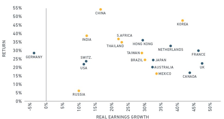 Finally, we can use these themes to help explain the different fortunes between individual countries. The last exhibit plots the returns of the major countries in the MSCI ACWI Index against their year-over-year growth in real earnings. Colors indicate market classification: blue for developed and yellow for emerging markets.