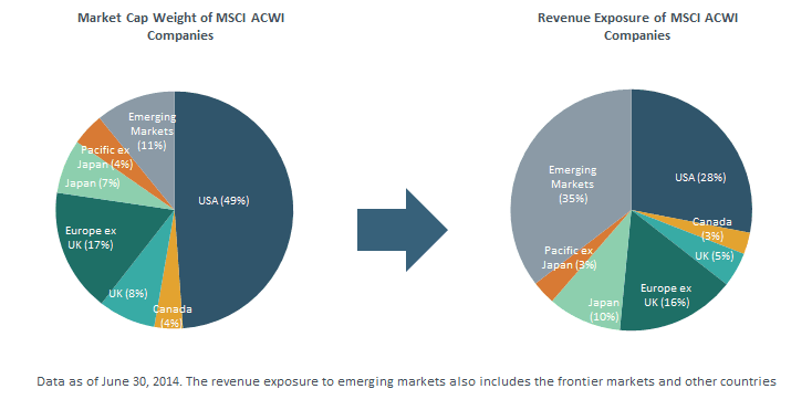 Indeed, with the continued integration of world markets, companies across different size segments are increasingly exposed to economic activity beyond their domestic borders. Consider this: As of June 30, 2014, Korea-domiciled Samsung Electronics Co. derived 90% of its revenues outside Korea and close to 50% outside emerging markets (EM). Yum Brands, a consumer discretionary company headquartered in the United States, generated 53% of its revenues from China and only 22% from the United States. We can see in the below exhibit how creating an index based on revenue exposures provides a striking contrast to one based on market capitalization.