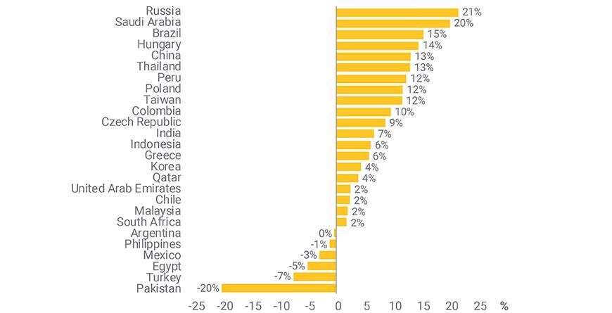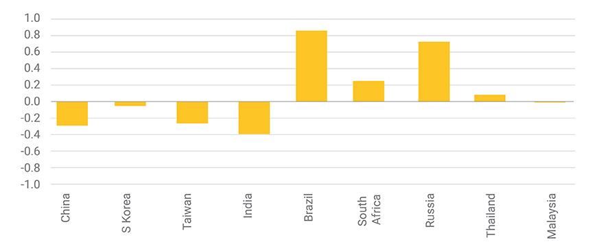 - Emerging markets' headline performance can hide a wide dispersion of country outcomes. The performance of EM stocks tended to be more affected by their underlying country than by their sector or style exposure.