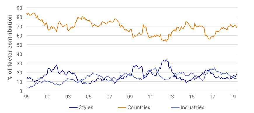 This wide dispersion in performance is supported when looking at the cross-sectional volatility (CSV)2 of the emerging-market stock universe across three systematic factor categories: countries, sectors and styles. In developed markets, the three factor categories all had similar contributions to stock-return dispersions. However, in emerging markets, the contributions to CSVs were distinguished with countries representing over 60% of the systematic factors, while both sectors and styles were below 20% for the majority of time over our sample period of 20 years. In other words, leaving aside the idiosyncratic component, the performance of EM stocks tended to be more affected by their underlying country than by their sector or style exposure.