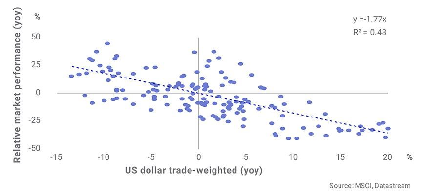 1From Dec. 31, 1987, to Sept. 30, 2019.2Defined as the standard deviation of returns across stocks in a given universe.3The economic exposure of a company to a target region or country is the proportion of its revenues coming from that region. As a general principle, MSCI estimates economic exposure from the geographic segment distribution of revenues by final markets/destination as reported by a company and the GDP weight of the countries and regions within a specific geographic segment. See the MSCI economic exposure data methodology.4Time series of the US dollar trade weighted index available from Datastream.5R-squared is a statistical measure of how close the data is to the fitted regression line.