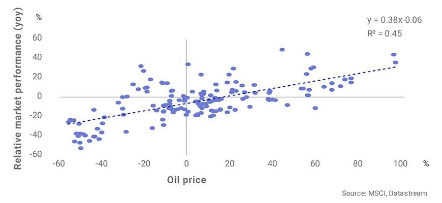 The price of oil is often another determinant macroeconomic variable, especially for large EM commodity producers. Based on MSCI's Barra Emerging Markets Model, EM countries have different exposures to oil, depending on whether they are a producer, such as Russia and Brazil, or importer, such as China, India and Taiwan. Historically, producers outperformed importers when oil prices rose (see exhibit below).