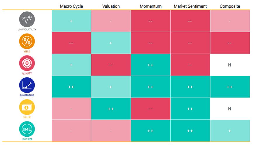 Our adaptive multi-factor framework is a model designed to analyze decisions about tilting toward factors. Our research has shown that factors were sensitive to changing market conditions and suggest there has been value in taking a holistic approach to factor assessment that encompasses not only the macroeconomic environment as shown above but also factor valuations, recent performance trends and risk sentiment.