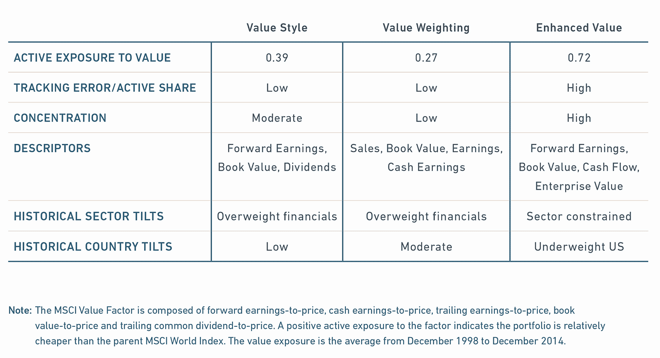 • High exposure indexes. Introduced in 2014, MSCI Enhanced Value Indexes combine multiple descriptors. High exposure indexes provide higher tracking error and higher active drawdowns when value is out of favor.