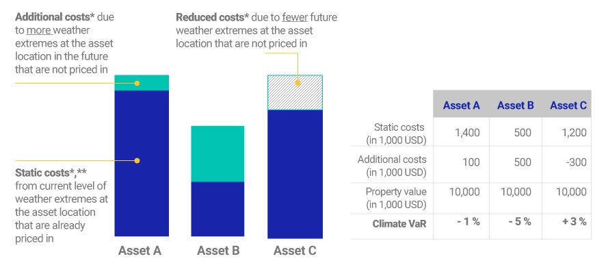 The change to hazard levels may also not be proportional to current levels. In the example below, we show three hypothetical assets that have different levels of physical risk exposure. Asset A has both a higher current and predicted future hazard exposure than Asset B. However, the projected increase for Asset B is larger, so Asset B has a higher value-at-risk percentage. Asset A, despite its overall larger exposure, has a smaller value-at-risk percentage, since this metric reflects costs not already priced in. Investors should therefore not always expect to see the highest value-at-risk percentages in assets with the highest current hazard exposures.