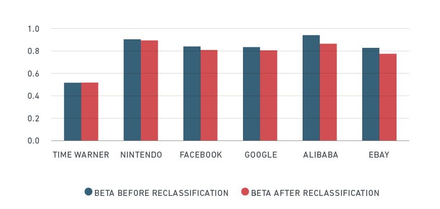 On Sept. 28, 2018 over USD 3 trillion in market capitalization will switch sectors because of changes to the Global Industry Classification Standard (GICS®)1 structure; specifically, the Telecommunications Services sector will significantly broaden and be renamed Communications Services. Our recent paper, "The New GICS Communication Services Sector," provides full details. What does this change mean for the risk profiles for six of the largest companies affected? While reclassifying a stock's sector or industry may change the way the market views that stock over the long term, financial theory says that reclassification alone should not dramatically change its short-term behavior. Our analysis suggests that industry changes occurring as a result of the GICS sector changes would have decreased predicted Beta and total risk for some of these companies.