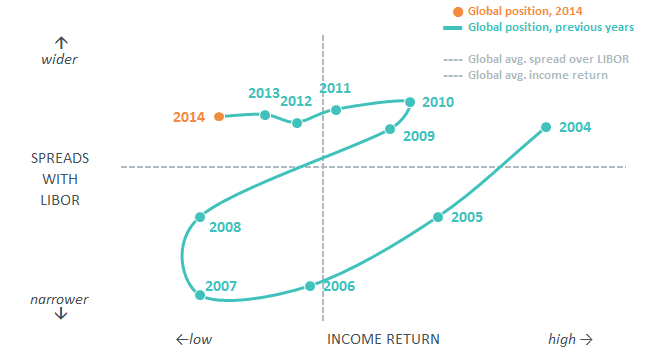 Historically, the majority of global real estate returns have come from income, which has made up more than 80% of the total return over the past decade. In 2014, however, growth in asset values represented 43% of the total return — more than double its long-term average contribution. This trend was driven largely by the weight of capital flowing to real estate and by yield compression. All the same, as of December 2014, income return remains above 5%, despite having fallen in each of the last four years, and is significantly higher than the yields available for global equities and bonds.