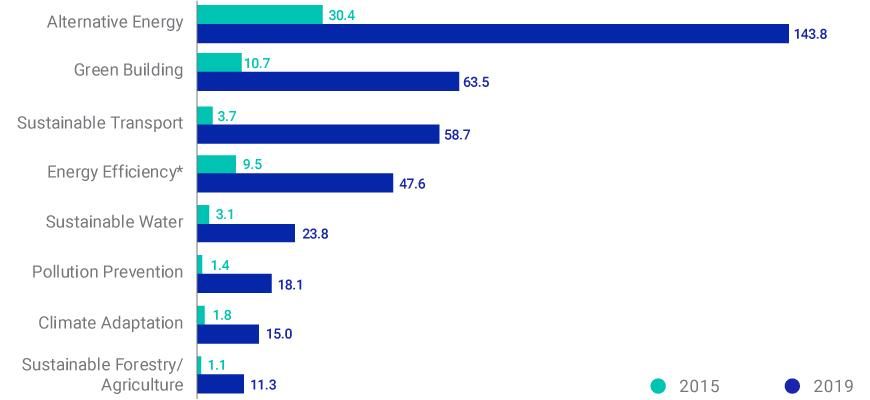 Unnamed: 0 Size of market | Green / Social / Sustainability Bonds ~USD 250 billion in 2019 | ESG-linked Loans ~USD 100 billion in 2019 |