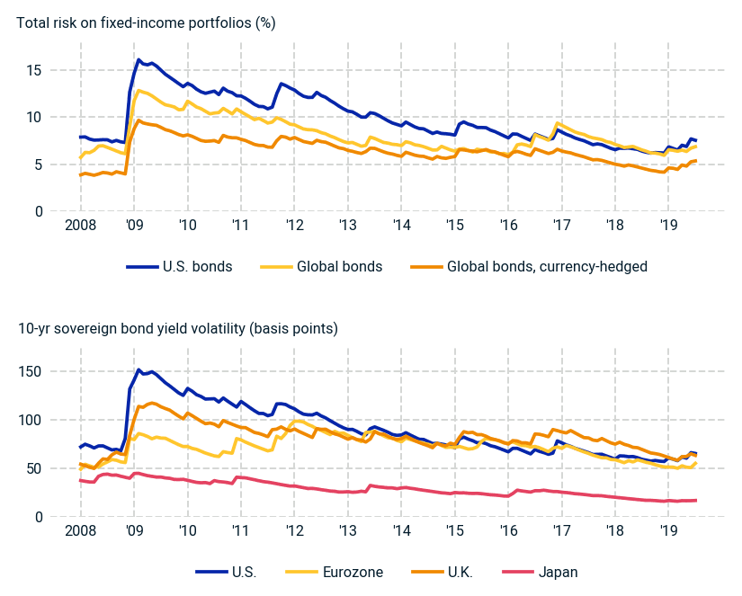 We used MSCI yield curves to quantify ex-post return volatility (or total risk) of a hypothetical U.S. Treasury portfolio and currency-hedged and -unhedged global government portfolios, between January 2008 and May 2019.3 These portfolios were chosen to hedge out the interest-rate exposure of an assumed liability benchmark.4 The currency-hedged global fixed-income portfolio consistently displayed lower total risk (see the exhibit below), and the U.S. Treasury portfolio generally had higher total risk.