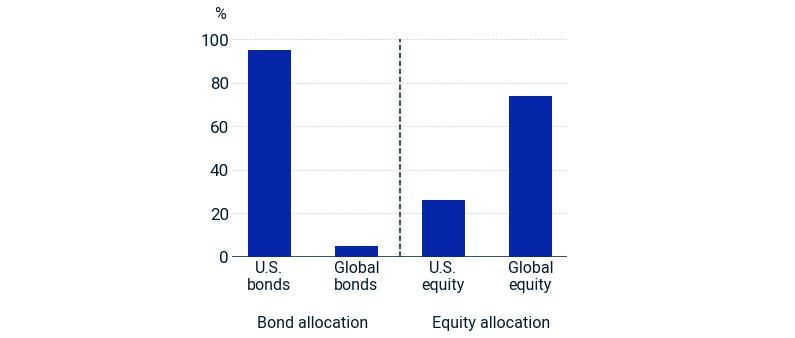 When we looked at the 20 largest U.S. DB plans, we found that their asset allocations showed two distinct patterns: home bias for bonds and global diversification for stocks, according to recently available financial reports.1 Plan investments in public assets typically pursued the well-known allocation strategy of 60% equity and 40% fixed income. Within the fixed-income portfolio, about 95% of the allocation was in domestic government and credit sectors, while the remaining 5% was invested globally. In contrast, in the equity portfolio, 74% of the allocation was linked to global benchmarks, demonstrating that country diversification played an important role in allocating equity assets.2