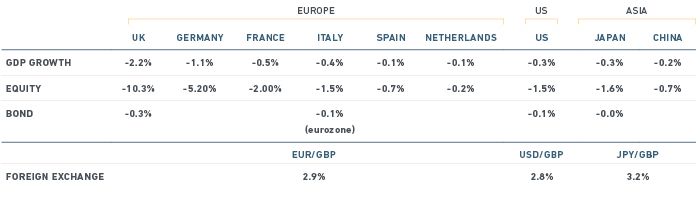 Brexit would shred growth across the EU, including by 4.2% in Spain, 3.7% in the Netherlands, and 4.3% in Italy. MSCI's Macroeconomic Risk Model suggests that equities markets across the continent would tumble as well, including by 21% in Spain, 18.3% in the Netherlands and 17% in Italy. The break-up of the world's largest trading bloc would ripple across the global economy. Growth in U.S. real GDP would fall 2.7% over the three years that follow a vote, with a corresponding decline of 13.1% in U.S. equities and a contraction of 0.53% on the yields in U.S. corporate bonds. Japan would slow 0.8% on an annualized basis, with a decline in equities of roughly 5%. The effect would be more attenuated in China, where Brexit could slow growth by 0.5% and cause equities to fall 2.4%. Looking across asset classes, the contagion scenario for Brexit would lead to incremental losses of 12% in global equities and losses in corporate and emerging-market debt. Government bonds would gain 2.1%. A global, diversified multi-asset class portfolio could suffer a loss of 7.3%.