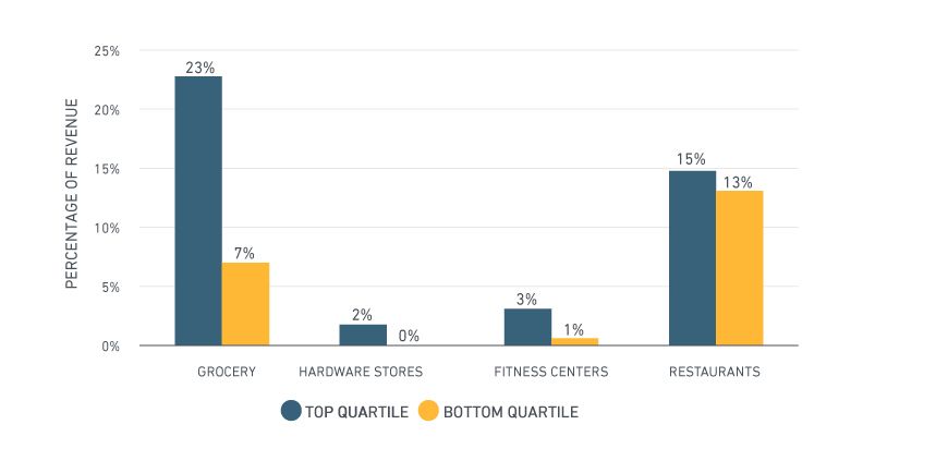 • Entertainment and Leisure: While top-quartile assets included a higher concentration of fitness centers than the bottom quartile, entertainment establishments are increasingly becoming an important element in shopping centers because of the experience they offer consumers.