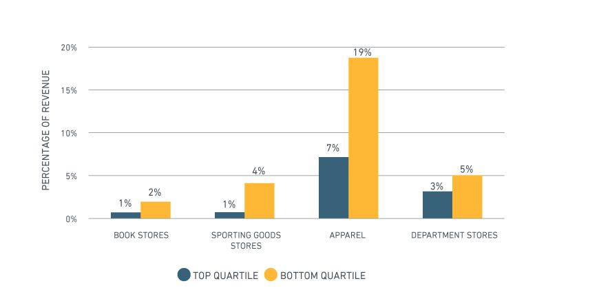 The share of certain tenant types varied strikingly between the best- and the worst-performing assets, as seen in the next exhibit. In the first exhibit, we see that top-quartile assets derived more revenue from experience-oriented and internet–resistant industries such as restaurants, fitness centers and supermarkets. Grocery exposure, in particular, seemed to produce a significant difference in asset performance. Online penetration in this sector has so far remained low in the U.S. Conversely, we see in the second exhibit that industries more vulnerable to online competition were prevalent in the bottom quartile. Unsurprisingly, apparel comprised a large proportion of under-performing industries for bottom-quartile assets.