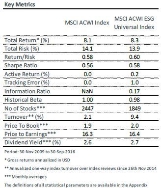 Backtested performance of the MSCI ESG Universal Index, while not indicative of future results, showed superior risk-return characteristics with a 1% tracking error (the degree to which a portfolio's performance deviates from its parent index). As shown in the charts below, the ESG Universal Index outperformed the MSCI ACWI Index (which represents 46 developed and emerging markets) by an annual average of 0.20 percentage points (hundredths of a percentage point) over a seven-year simulated period with a slightly lower level of ESG risk.¹