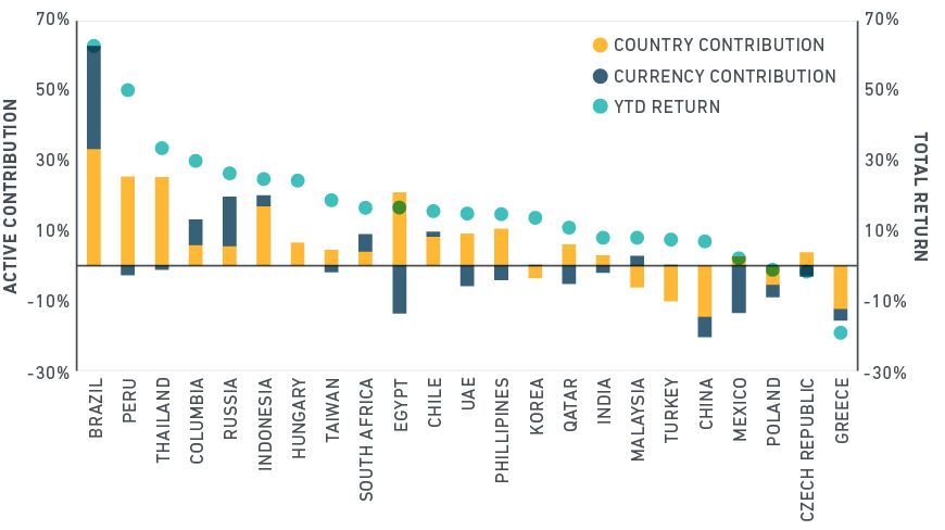 A broad-based emerging markets allocation has been effective in capturing the dramatic transformations of emerging economies over the last 20 years. But as a review of the performance of emerging markets this year highlights, countries that share characteristics can differ dramatically in drivers of return. The differences have offered opportunities for investors.