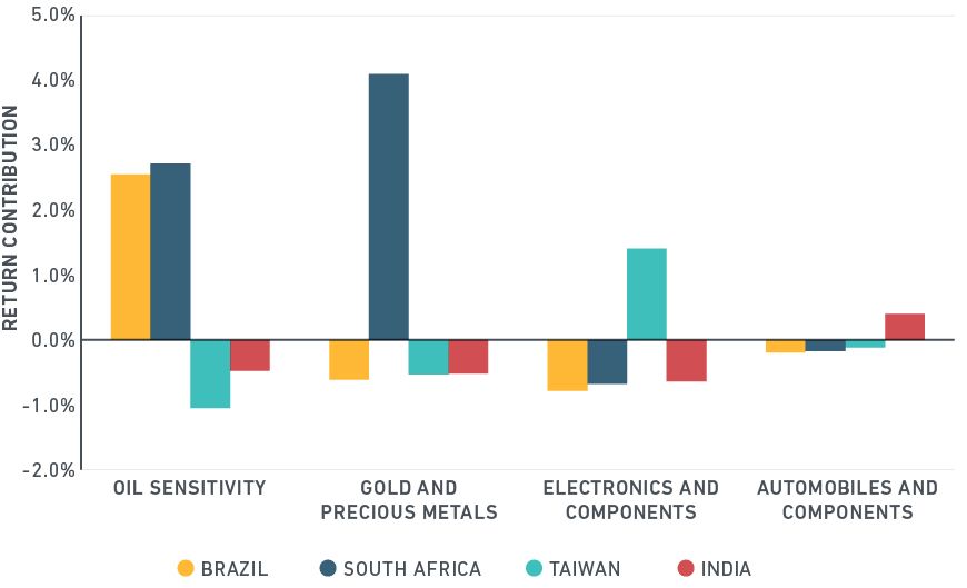 Finally, style and industry effects can be substantial, based on MSCI's risk model, which contains factors tailored for emerging markets. The oil sensitivity factor is one and quantifies movements of oil prices for firms inside and outside the energy sector. Positive return to this factor represents a basket of stocks that tend to do well as oil prices rise.