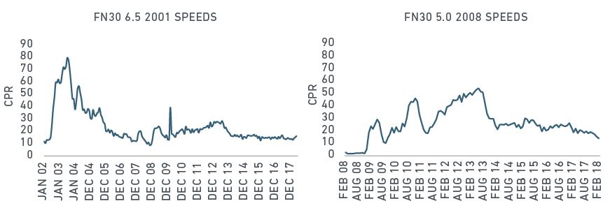 The agency mortgage universe has experienced multiple types of refinance regimes, as we see when we compare the 2003 refinance wave with more recent ones. The FNCL 2001 6.5s (Fannie 30-year 2001 origination 6.5s coupon mortgage loan cohorts) reached a conditional prepayment rate (CPR) of 80 during the 2003 wave, while those of FNCL 2008 5s, the most credit-worthy cohort after the global financial crisis, never reached higher than the lower 50s during its refinance waves.