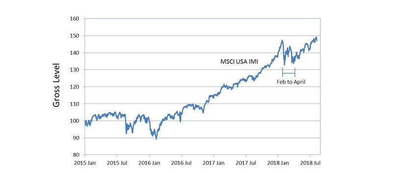 Since January 2015, the U.S. stock market has climbed fairly steadily, with some noticeable exceptions, as we can see in the exhibit below for the MSCI USA IMI. Thus, long-term investors have benefitted from staying the course.