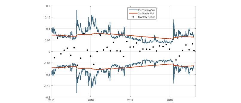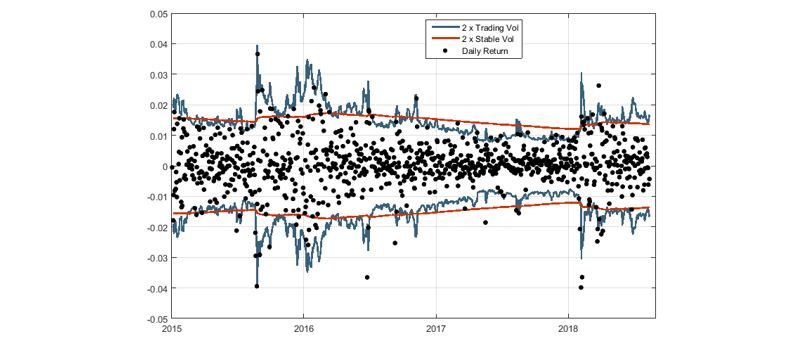 - The increased responsiveness of the volatility forecast helped to reduce the number of daily returns outside the two-sigma lines. In 2018, there were 12 outlier returns with respect to the Trading volatility forecast, while the Stable volatility forecast resulted in 17 outliers. This more responsive forecast exhibited superior performance when used for risk control on the daily horizon.