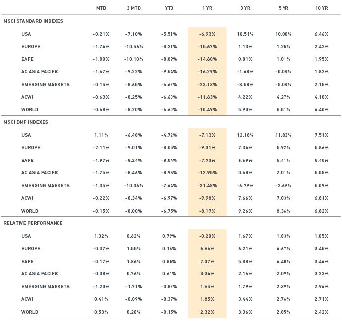 Finally, investors can decompose excess return for the MSCI World DMF Index, which, as the table below shows, outperformed the broad market by 2.35% over the period.