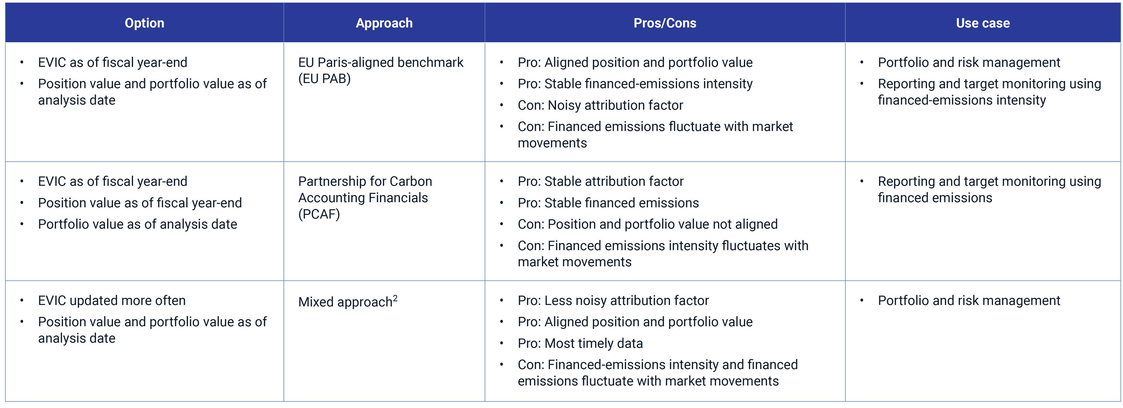 - When calculating portfolios’ financed emissions, investors are faced with the choice of timeliness or data alignment — whether to use the latest data points, line up the data points by date or use a mixed approach.