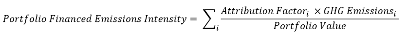 Financed-emissions intensity is a current climate-impact metric that indicates the amount of GHG emissions an investor would be responsible for per dollar of financing. It is calculated as the ratio of total GHG emissions normalized by portfolio value. This allows for a comparison of portfolios regardless of their size.