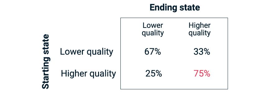 The exhibit above shows the historical likelihood of a firm's transitioning from one quality cohort to another a decade later. Perhaps due to their wide economic moats or fortress balance sheets, 75% of the firms that began as high-quality remained that way. In contrast, only a third of the lower-quality firms were able to cross the chasm to higher quality after a decade.