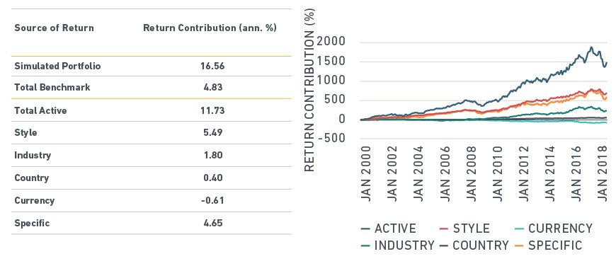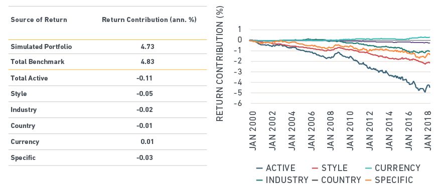 The resulting backtested portfolio eliminated the loss due to style factors (see exhibit below). In this example, the portfolio also outperformed the benchmark by 43 bps annually, of which 39 bps was due to stock-specific sources. This should not be expected to happen in all settings.7