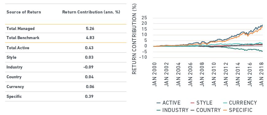 Recent studies of "sin stocks" have shown their performance can be largely explained by standard asset pricing factors, such as profitability and investment.2 From December 1999 through July 2018, tobacco industry stocks in the MSCI ACWI Index outperformed the index as a whole by 11.7% annually.3 Using the MSCI Global Total Market Equity Model to disentangle the sources of this outperformance, it turns out it was mostly due to style factors (5.5%) and stock-specific sources (4.7%).