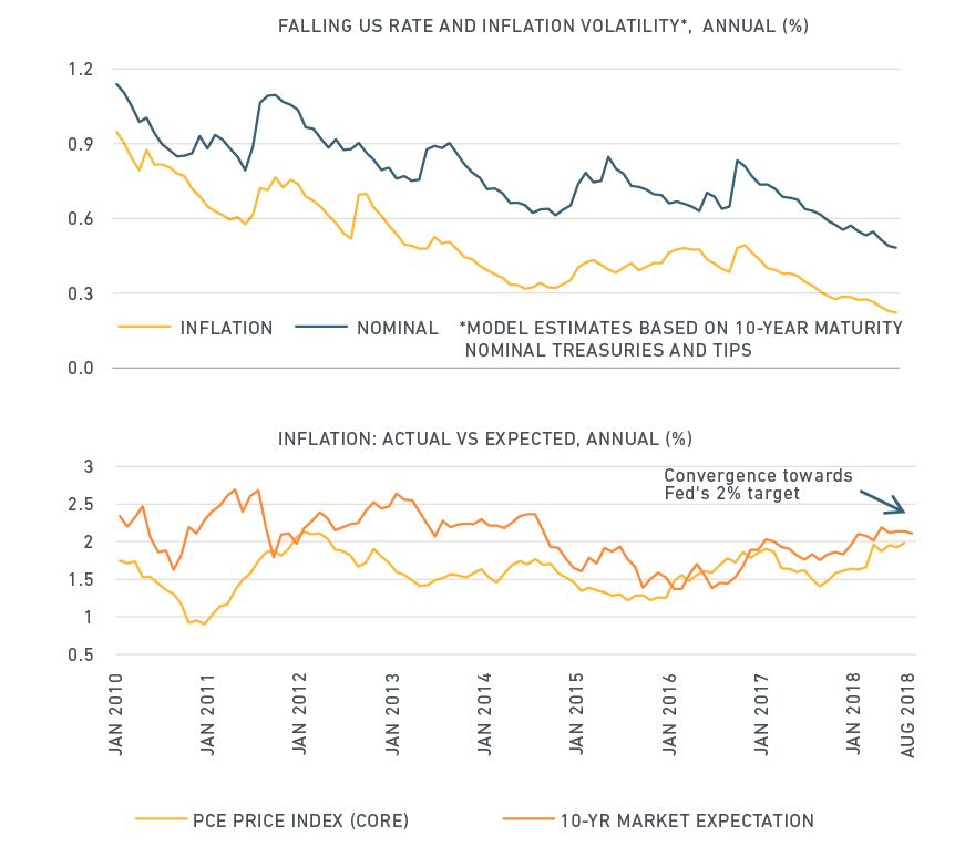A remarkable calm has settled upon the U.S. bond market, with interest rate and inflation risk now at their lowest levels of the decade. This optimistic sentiment was underscored at the annual Jackson Hole, Wyoming conference where Federal Reserve (Fed) Chairman Powell highlighted that there is "…no clear sign of an acceleration (of inflation) above 2% and there does not seem to be an elevated risk of overheating."1 While the data suggests there is good reason over the short term for the Chairman's optimism and the market's relative calm, longer term economic and policy uncertainty clouds the inflation picture. Despite the Fed's best of intentions and the bond market's supreme confidence in the Fed's ability to maintain inflation around 2%, investors may be downplaying the possibility of future volatility. VOLATILITY OF INTEREST RATES AND INFLATION HAS DECLINED OVER THE DECADE To get a better perspective on the situation, we used the MSCI Integrated Model to analyze interest rate and inflation volatility from January 2010 to August 2018.2 As we can see in the exhibit below, over this period, the 10-year nominal yield volatility has fallen to 48 basis points (bps) per year from a level of 114 bps. Ten-year inflation volatility has declined even more, standing now at only 22 bps per year. We attribute higher volatility earlier in the decade to significant market uncertainty over the course of inflation and economic growth. Starting in Q1 2010 and extending to Q4 2015, bond market inflation expectations consistently exceeded realized inflation as investors repeatedly misjudged the impact of the Fed's quantitative easing programs on prices.3
