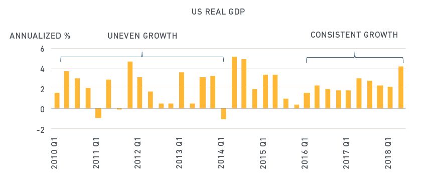 Since Q1 2016, realized and expected inflation have closely tracked each other and have recently converged to the Fed's 2% inflation target. We believe this alignment of expected and realized inflation is an important cause of the decline in rate and inflation volatility. Another factor behind the shift in volatility is gross domestic product (GDP) growth, which has been rock solid and generally increasing over the past several years.4 This stands in stark contrast to the uneven growth experienced during the first half of the decade. Stability in macroeconomic conditions has allowed the Fed to be more vigilant in focusing on its inflation target.