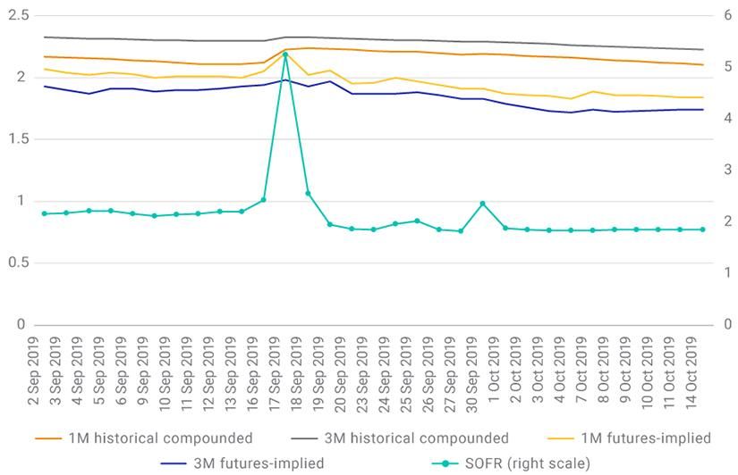 1The Alternative Reference Rates Committee selected SOFR, the interest rate on secured overnight loans collateralized by Treasury securities, to replace LIBOR in 2022.2“Repo gyrations bode ill for move away from Libor.” Financial Times, Sept. 19, 2019. “Repo-Market Tumult Raises Concerns About New Benchmark Rate.” Wall Street Journal, Sept. 23, 2019.3“Repo-market ructions were a reminder of the financial crisis.” Economist, Sept. 26, 2019.4“Big Banks Loom Over Fed Repo Efforts.” Wall Street Journal, Sept. 26, 2019.5“US Repo Market Fact Sheet, 2019.” Securities Industry and Financial Markets Association, Sept. 18, 2019.6“A User’s Guide to SOFR.” Alternative Reference Rates Committee, April 2019.7Heitfield, E. and Park, Y.-H. “Indicative Forward-Looking SOFR Term Rates.” Federal Reserve Board, April 19, 2019.8“New York Fed to continue operations in overnight funding market until mid-October.” CNBC, Sept. 20. 2019.9“Fed to resume asset purchases to prevent a cash crunch.” Financial Times, Oct. 8, 2019.