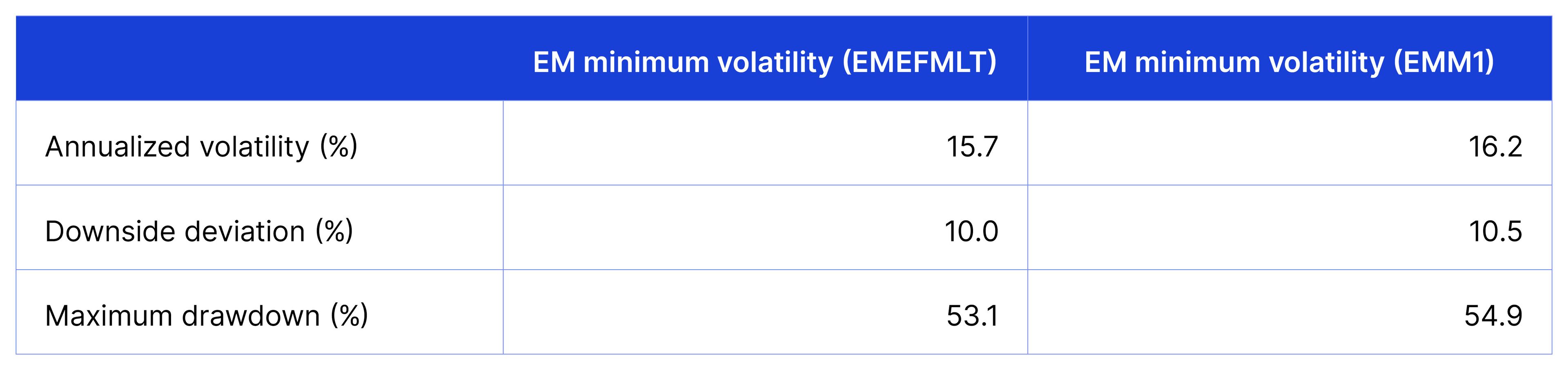 To help assess the impact of the split-market risk-model estimation framework, we simulated minimum-volatility strategies based on the old (EMM1) and new (EMEFMLT) models.[1] Over the 20-year simulation period, the EMEFMLT-based portfolio consistently exhibited lower realized total risk and a smaller maximum drawdown than the EMM1-based portfolio. The three-year rolling volatility was also consistently lower than that in the EMM1-based strategy, especially during periods of region-specific stress, such as China's stock market crash in 2015, the concurrent currency crises in Turkey, South Africa, Indonesia and Argentina in 2018 and the 2018-2020 U.S.-China trade war.
