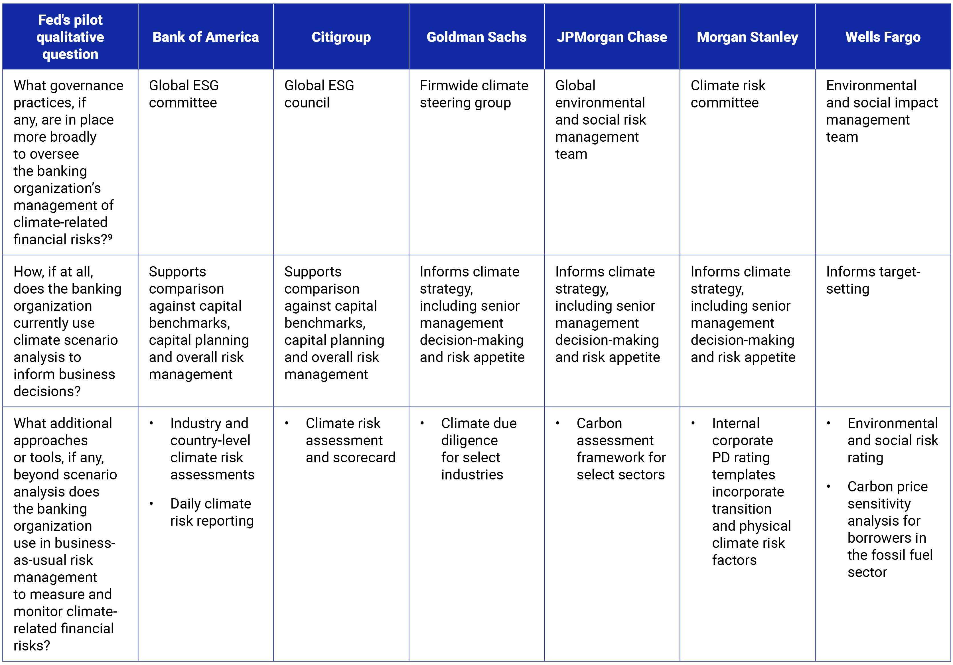 In addition to providing credit-risk projections, the six banks must also respond to qualitative questions on governance and risk management practices to help the Fed understand their current approaches and challenges in evaluating climate-related financial risks. Our analysis of the banks' most recent Task Force on Climate-related Financial Disclosures (TCFD) reports indicated that all the banks have developed their own environmental credit policies related to oil and gas and power utilities. They were, however, at varying stages of developing and using climate-risk measurement approaches to inform business decisions. For example, Wells Fargo noted it uses climate scenario analysis to set enterprise-level targets for net-zero in 2050 and interim 2030 sector targets, while Bank of America and Citigroup disclosed that they are beginning to integrate the results into firmwide risk management and capital planning.