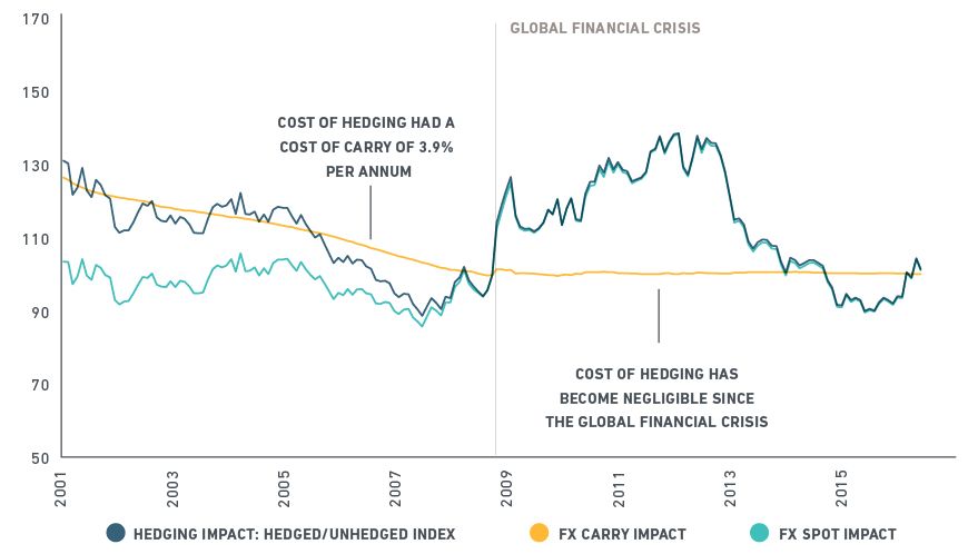 The chart below shows the relative performances of the MSCI Kokusai hedged index against the non-hedged index. A yen-based investor who hedged their foreign currency exposures prior to the financial crisis would have underperformed those who didn't hedge because of the carry cost, which was estimated at 3.9% per year.